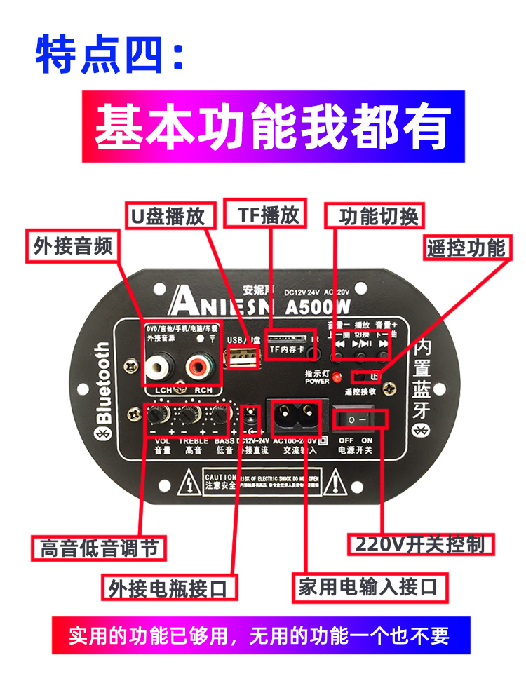 双咪插孔功大功率蓝牙功放板12V24V220V车载家用唱歌音响板